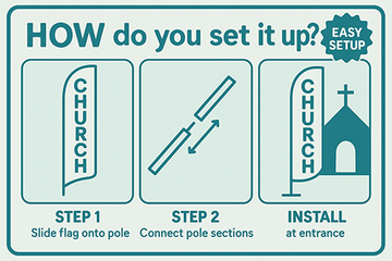 Beyond its vibrant colors and dynamic movement, the flag features a quick assembly system reflective of the church's readiness to welcome guests immediately. It’s not just a flag but an ever-present invitation, a constant reminder of your church's open doors and hearts.