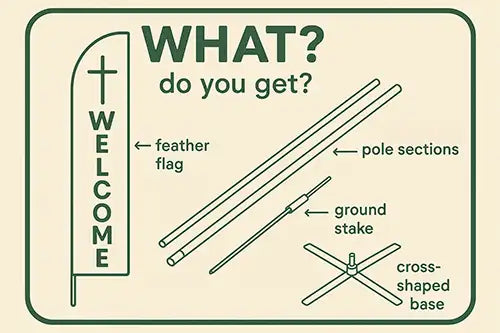 Be reminded you need to select 3 components in the options to have a full Feather Flag Kit ready for set up: (1) Your custom-printed feather flag in your chosen size, (2) The multi-piece flexible fiberglass pole that assembles in under 5 minutes, and (3) Your choice of one base - either a ground spike for soft surfaces (grass, soil) or a cross base for hard surfaces (concrete, asphalt). You can also purchase flags only if you already have poles and bases.